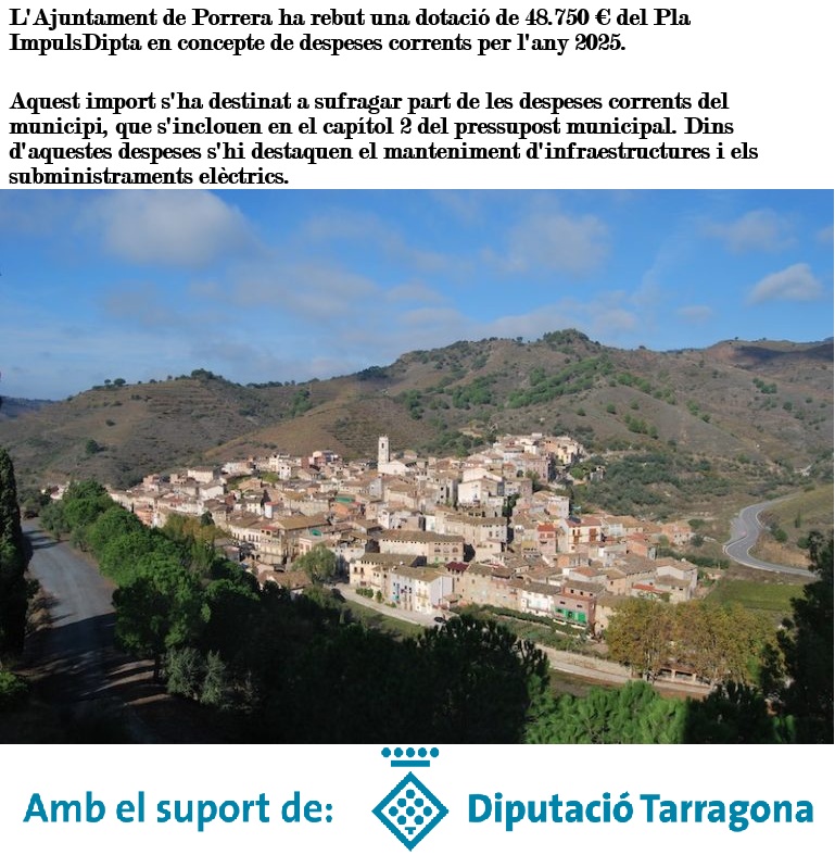 L’Ajuntament de Porrera ha rebut una dotació de 48.750 € del Pla ImpulsDipta ( @dipta_cat ) en concepte de despeses corrents per l’any 2025.